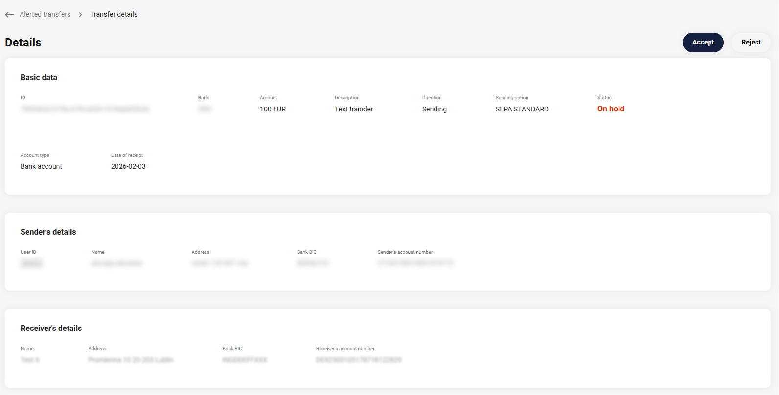 It allows payment institutions to exercise direct control over compliance processes. You can manage and execute AML-related decisions for both incoming and outgoing transfers, including reviewing and approving or rejecting transactions based on established rules and your risk assessment. |