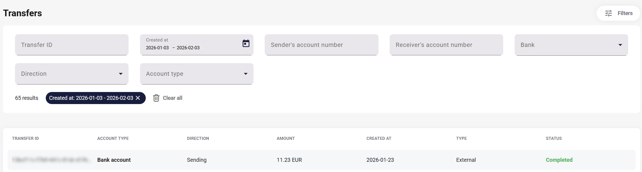 Just like in the Transfers tab, you can filter the results. The available filters are: