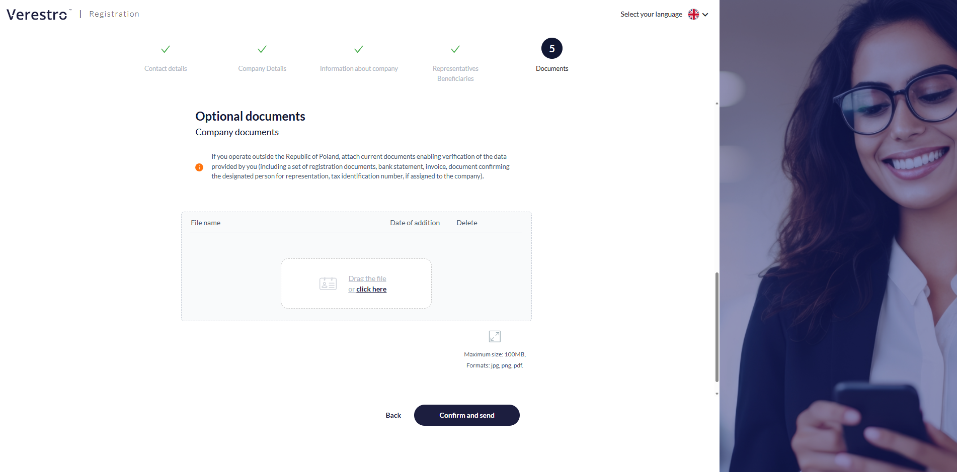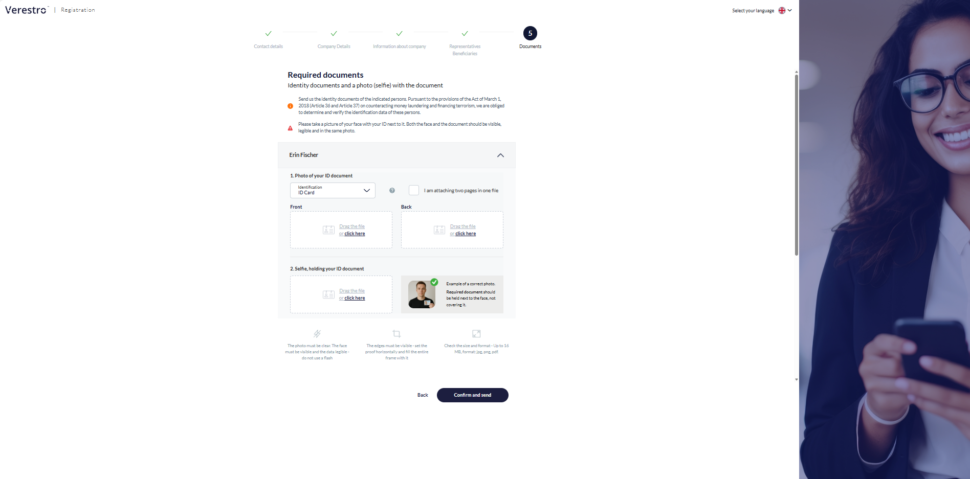 The final stage is the authentication of the entered data. The user selects the type of identity document and then attaches clear photos of it (front and back) as well as a facial photo (selfie) of the previously indicated persons.