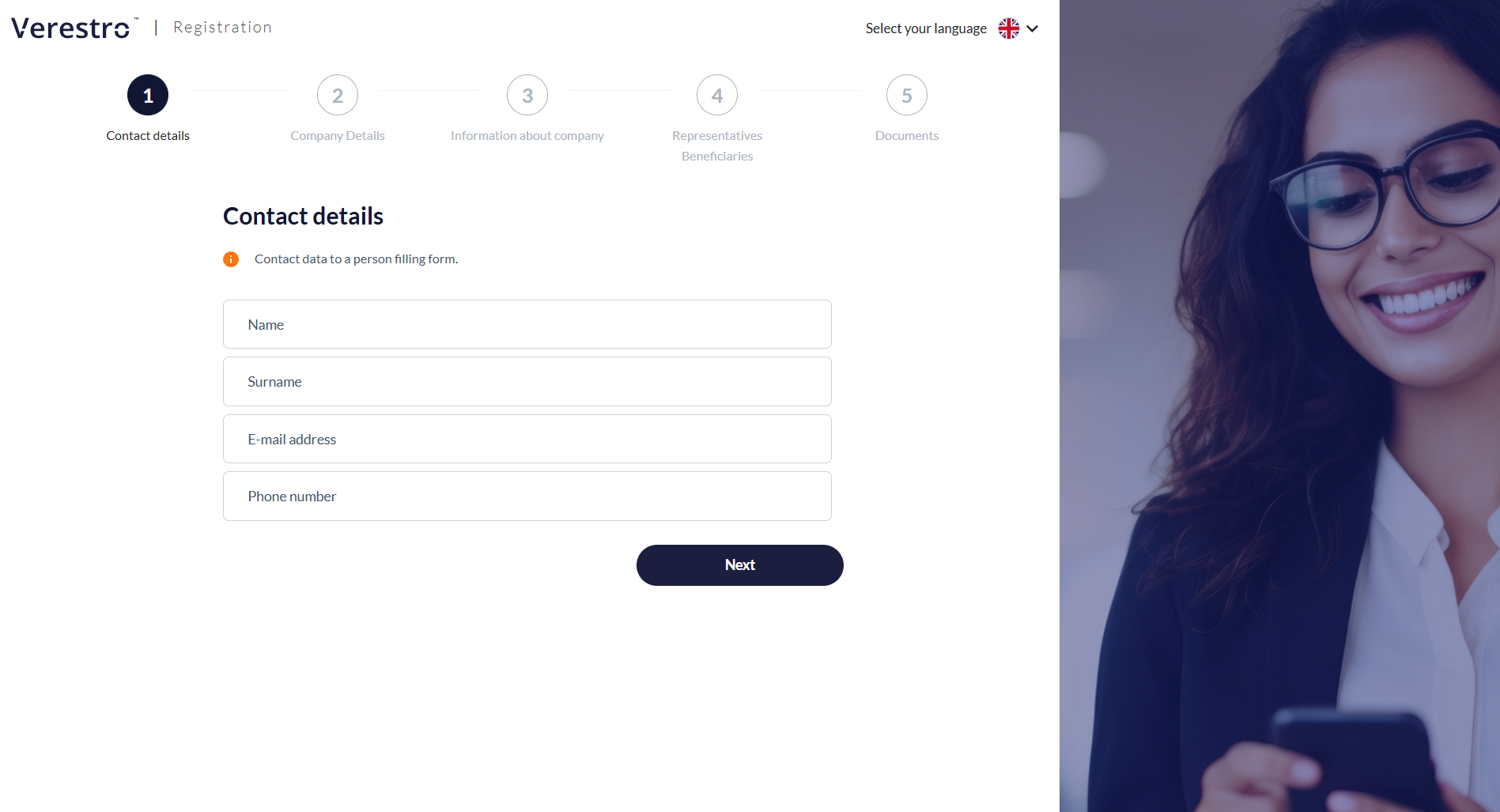 The process begins with providing the basic details of the person initiating the registration: first name, last name, e-mail address, and phone number.