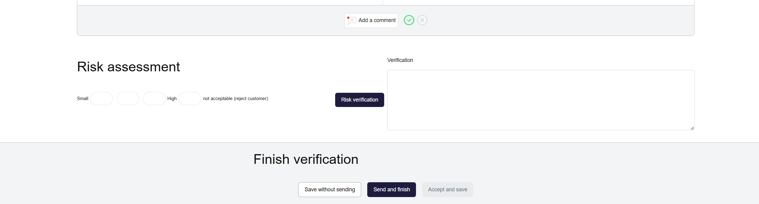 To complete the verification, the analyst must first review and accept all sections of the application, and then assign an appropriate risk level to the entity. After the final approval of the process, the system automatically sends an e-mail to the client with the decision (acceptance or rejection) and – in the case of a positive verification – attaches a framework agreement template. From this point on, the client's data is locked for editing unless the operator initiates the "periodic verification" procedure.