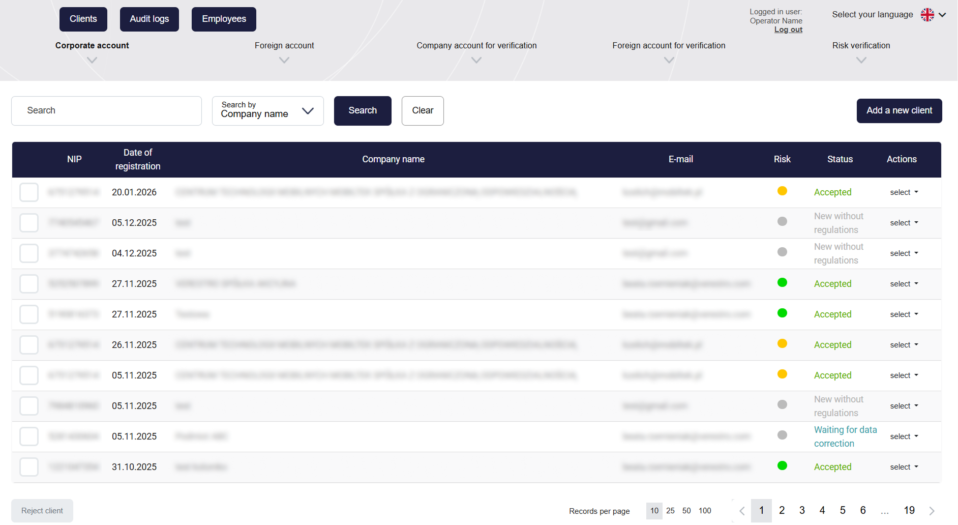 The system automatically assigns statuses to clients reflecting the stage of their verification- from "New", through "To verify", "Waiting for data correction", up to the final "Accepted" or "Rejected".