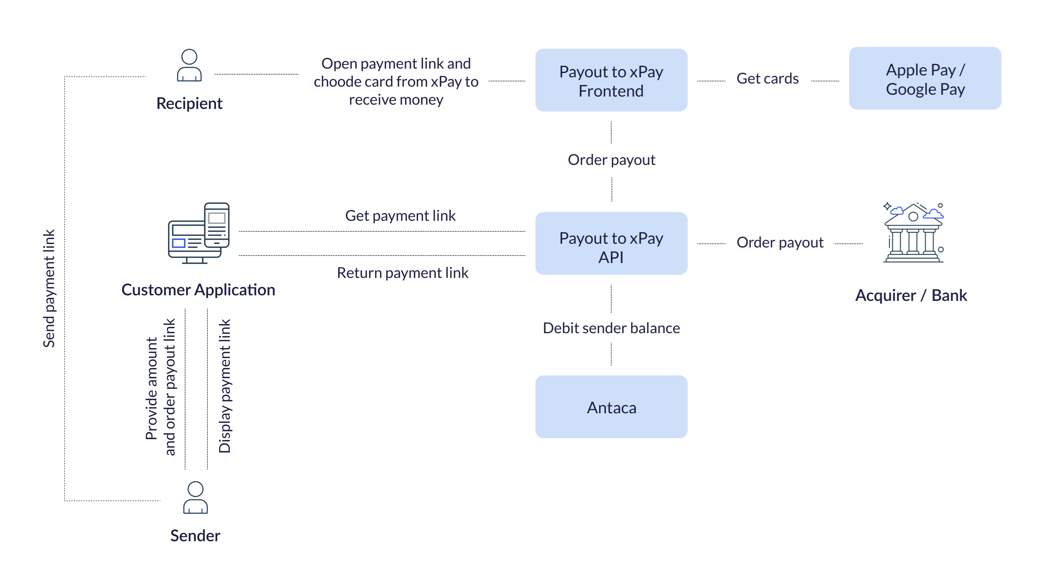 | 5. Processing payment. Payout to card and xPay API will perform the order to top up the recipient's card by contacting the acquiring institution and debiting the sender's balance in Antaca. |
