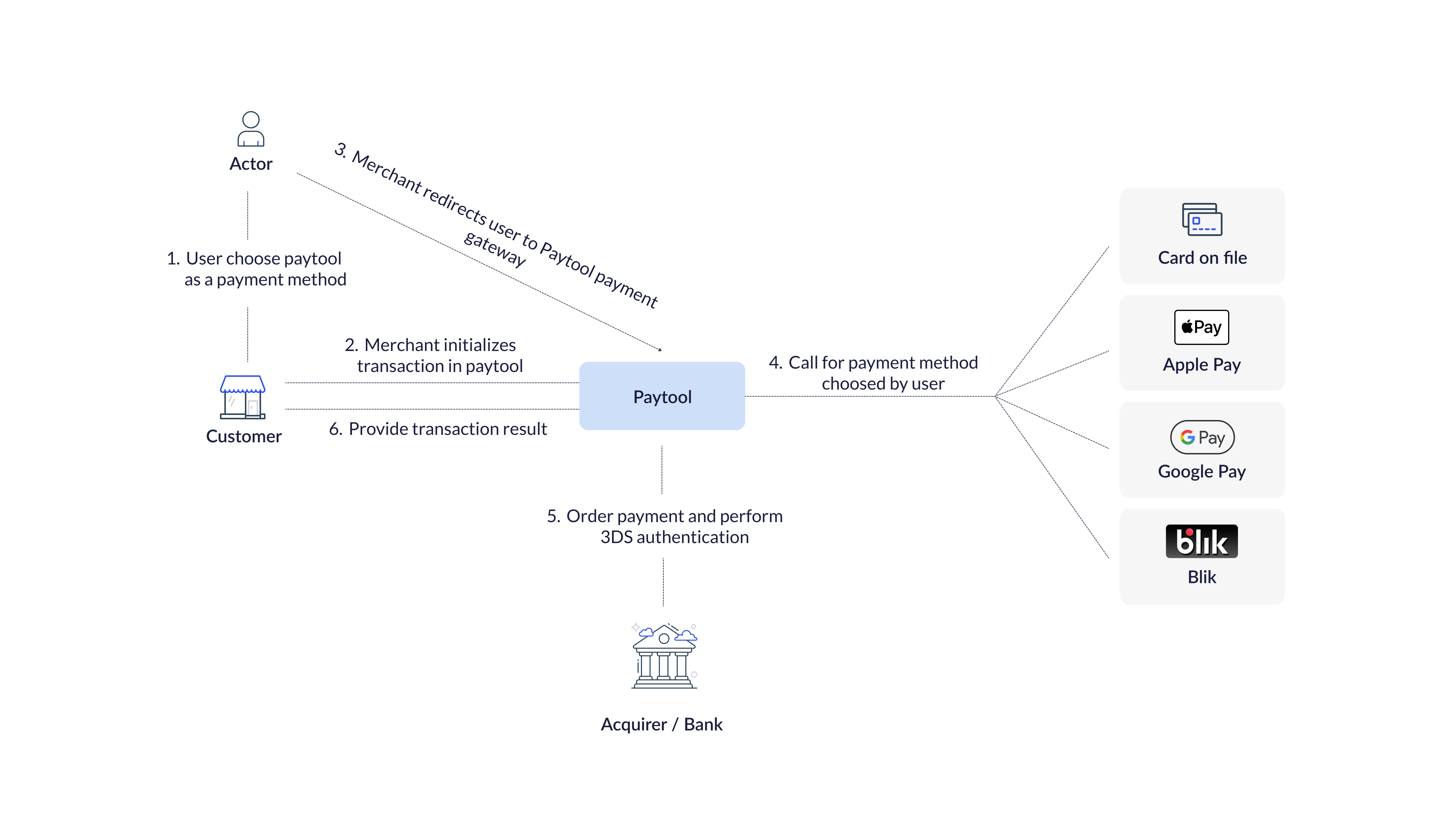Institution that settles payments. Paytool communicates with the Acquirer to order the transaction and authenticate the card holder using the 3D Secure protocol. |
