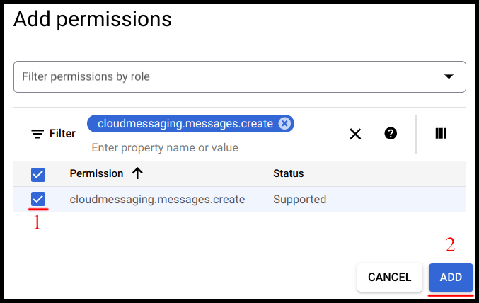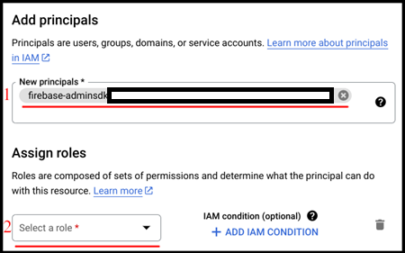 Input e-mail in New principals field (1) for account which will be using the new role (principal provided directly or in configuration file), and next in Assign roles section select a role (2)from a list